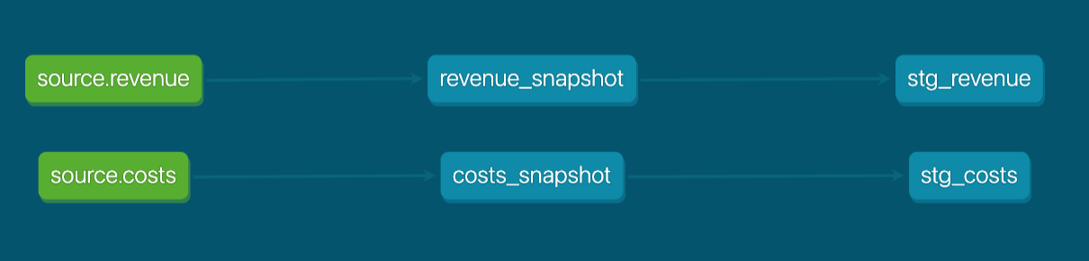 After joining in the seed file (check out Tackling the complexity of joining snapshots), her new DAG looks like this: